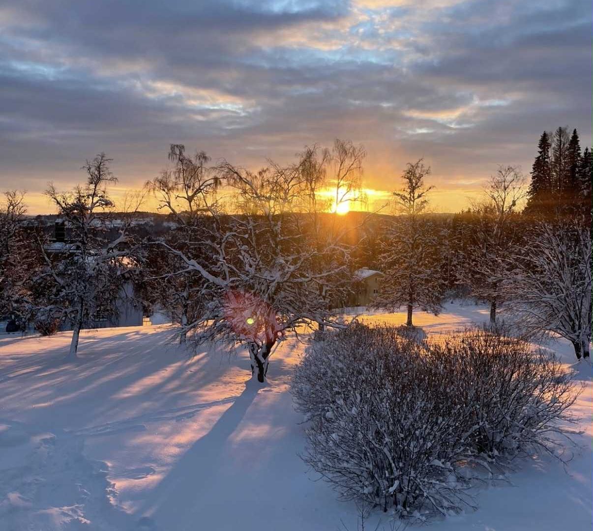 Nå er vi på Ringvål, et stille og fint område på vei til Byneset. Bildet er tatt fra soveromsvinduet, gratis solnedgang hele vinteren!
